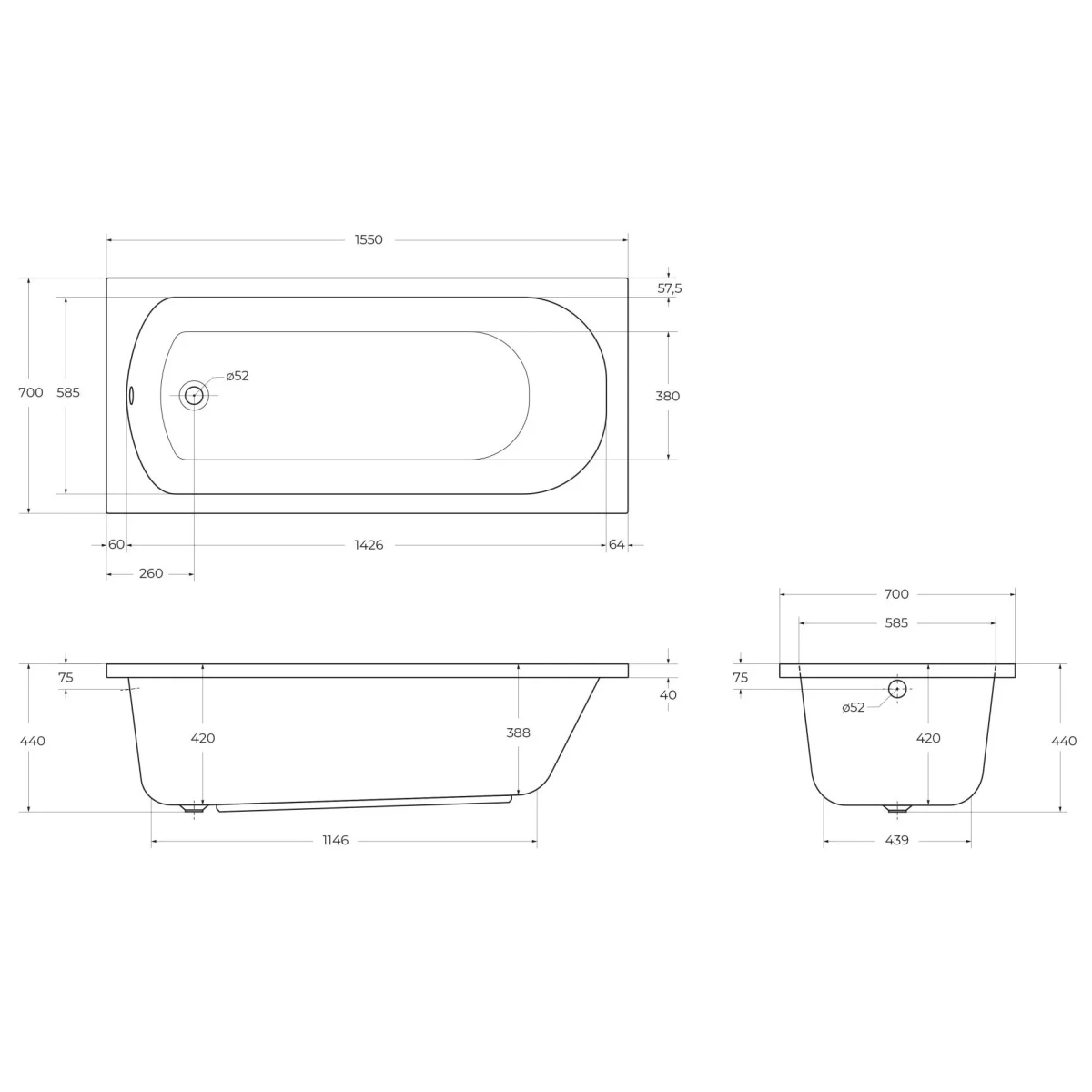 - Размеры чаши ванны (ШхВхД): 700х440х1550 мм.